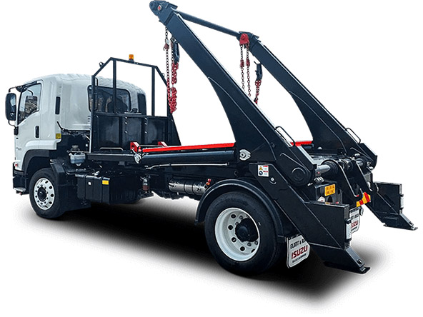 A skip loader is a truck fitted with hydraulic lifting arms used to pick up and drop off smaller skips (commonly 2m³ to 8m³). The arms lift the skip up and over the truck, placing it securely on the body for transport.